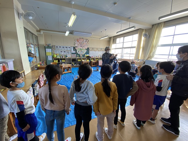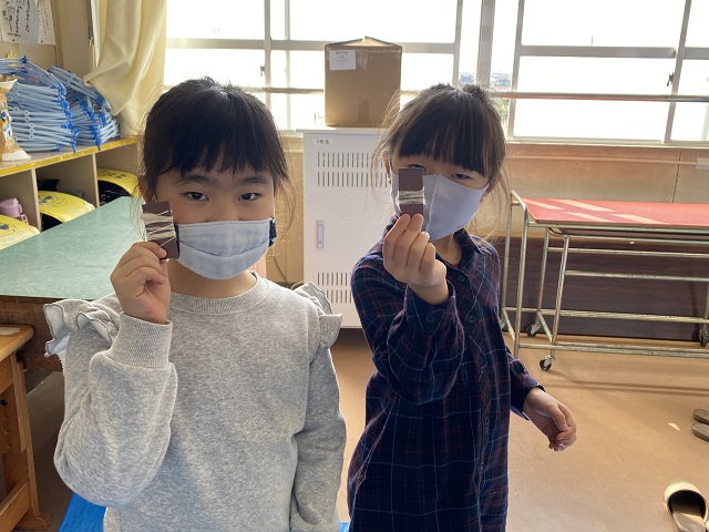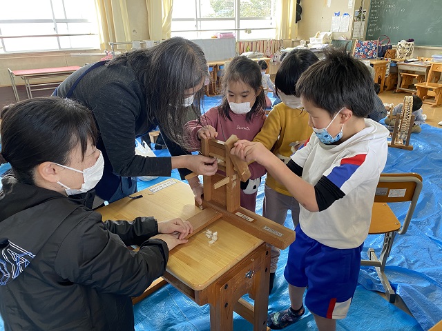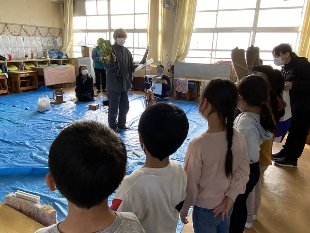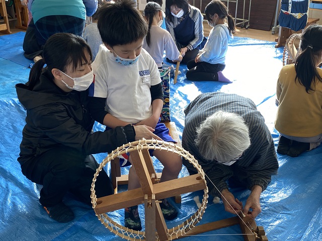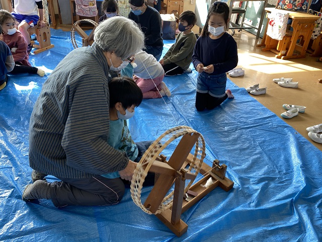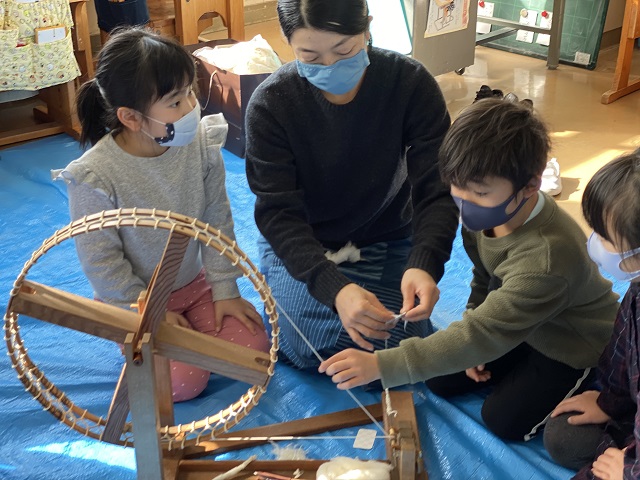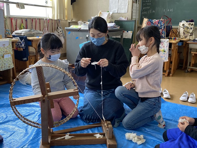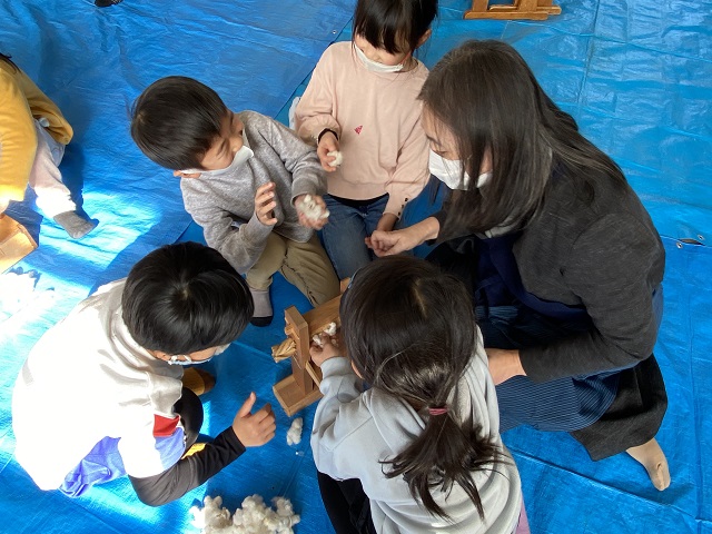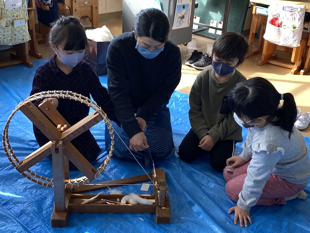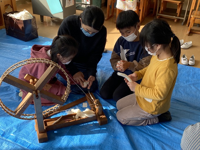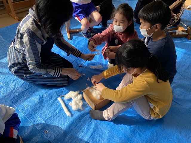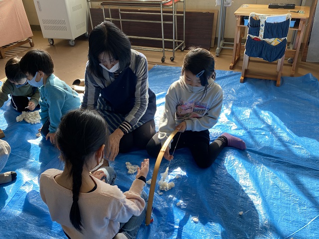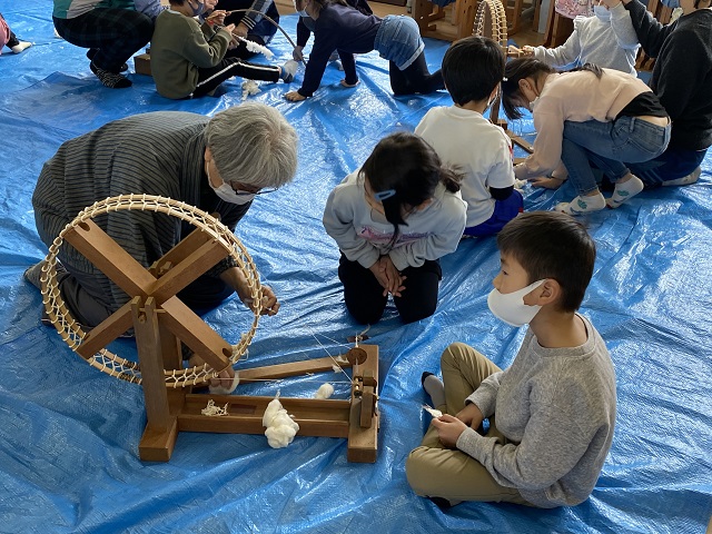 夕づる会のみなさんに来ていただき糸車体験をしました。道具の説明を聞いた後、綿を使って「種を取り出す」「綿を柔らかくする」「糸をつむぐ」作業を体験しました。自分で紡いだ糸を記念にいただきました。