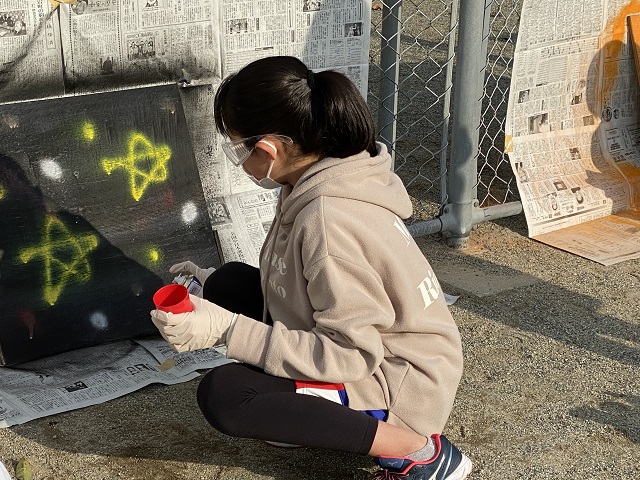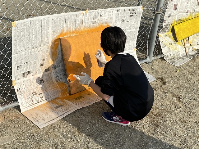 文集グループは作業が一段落したようで、校務員さんがごみを運び出すとき使うリヤカーの側面の板にペンキ塗りをしていました。