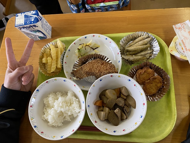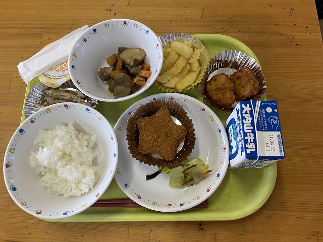 通常のメニューに「星形コロッケか鮭フライ」「プリンかゼリー」を選びました。チキンナゲットとポテトは6年生全員につきました。