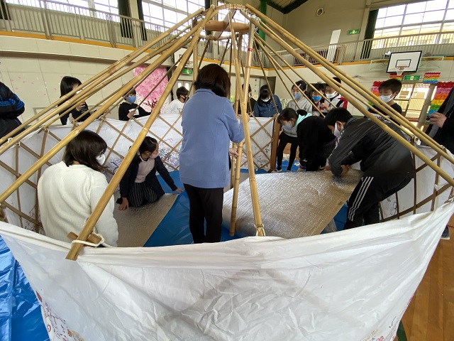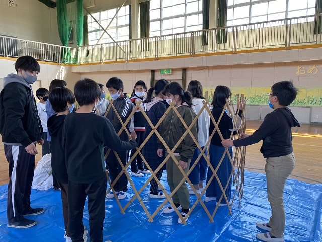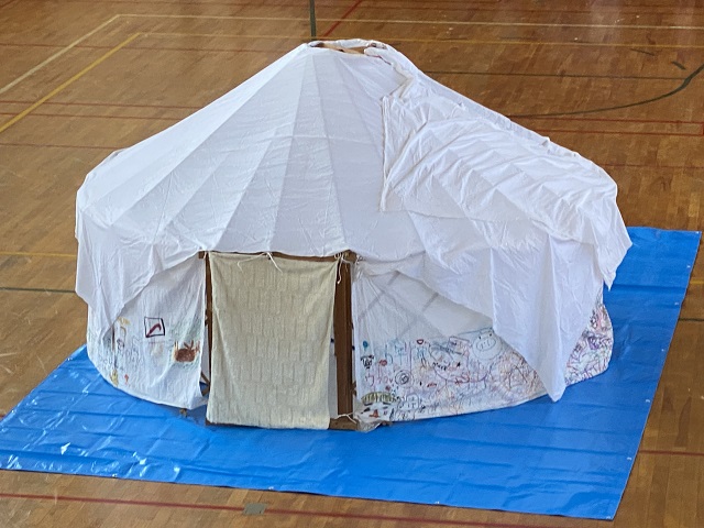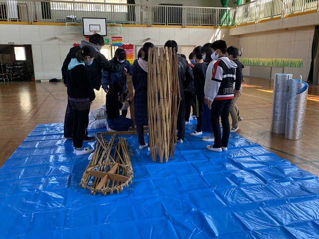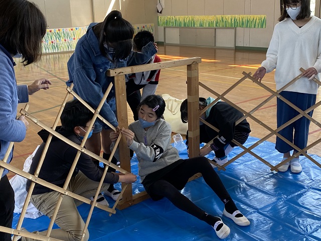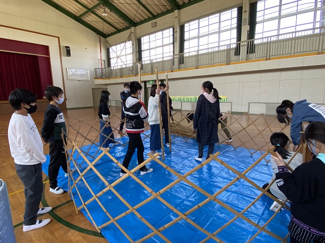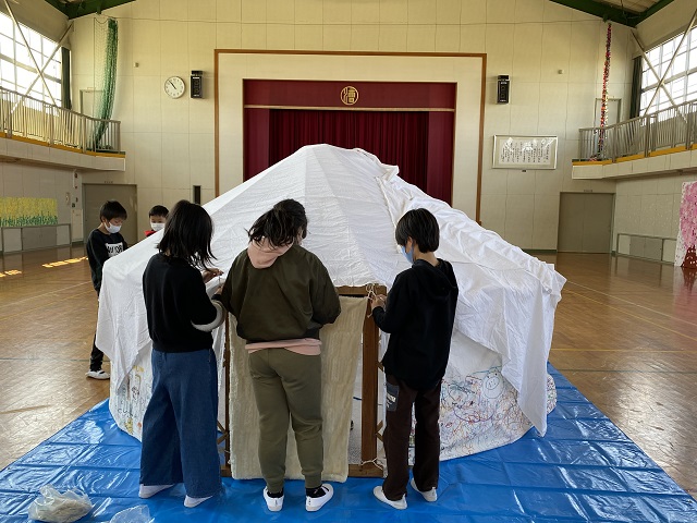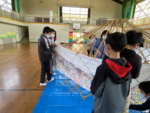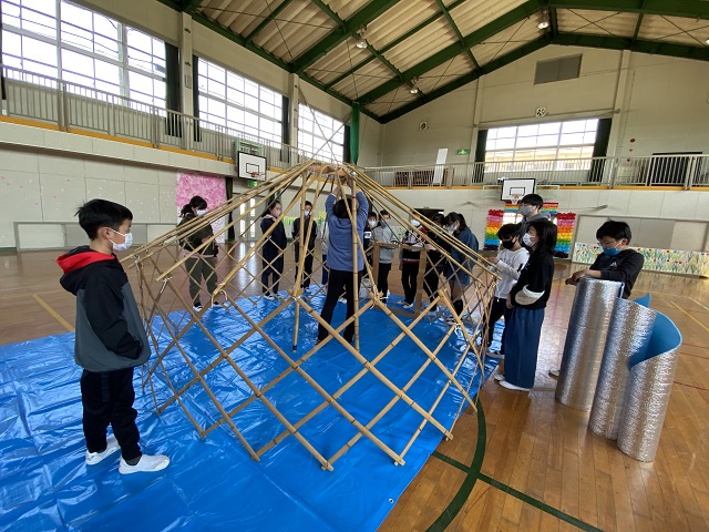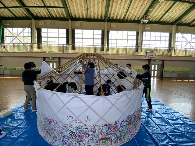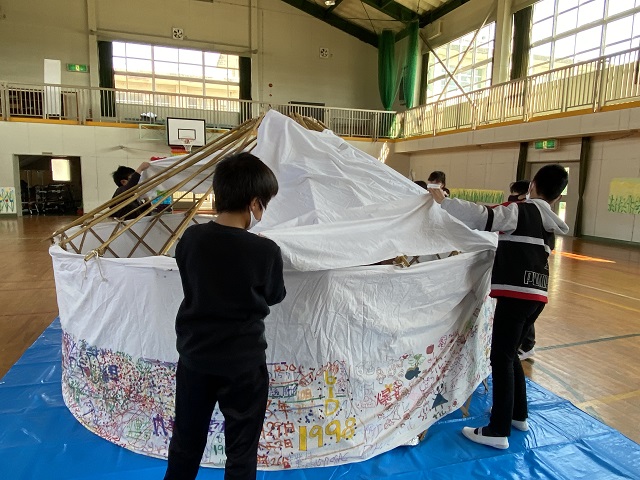 5年生は担任所有のゲル体験をしました。骨組みが1つでもないとうまく建てられないこと、みんなで協力しないと組み立てられないことなどを学びました。5年生はみんなが力を合わせて活動できる子どもたちなので、あっという間にできました。遠く離れて眺めると2年生で学習した「スーホの白い馬」を思い出したようです。