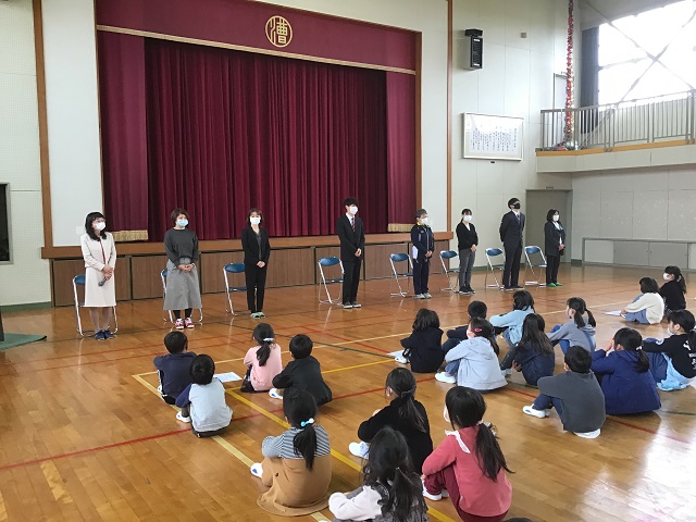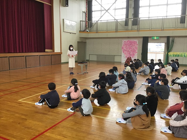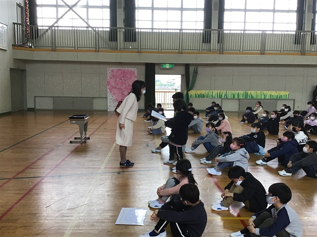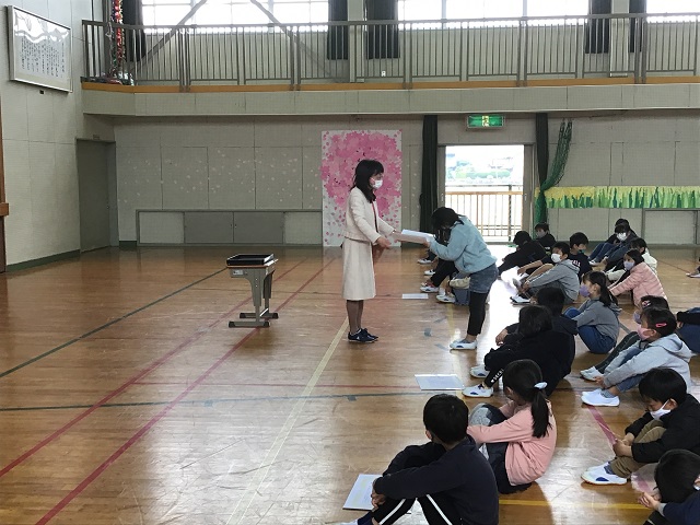 修了式が体育館で行われました。各学年の1年間の成長を紹介し修了証を授与することで修了式としました。