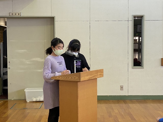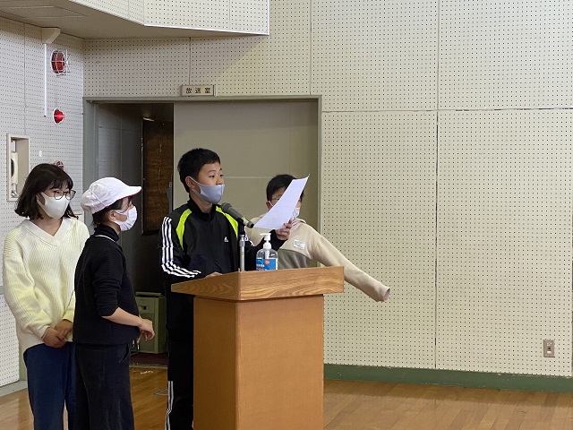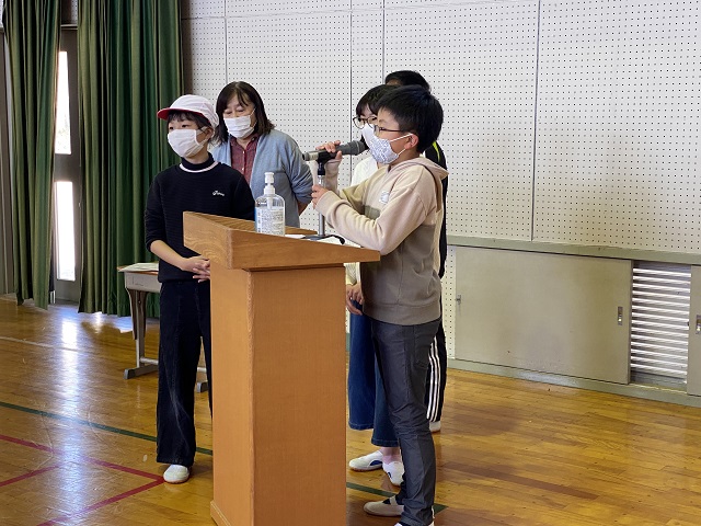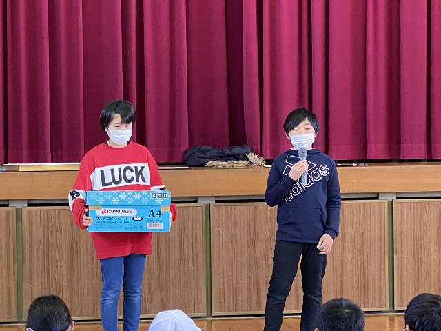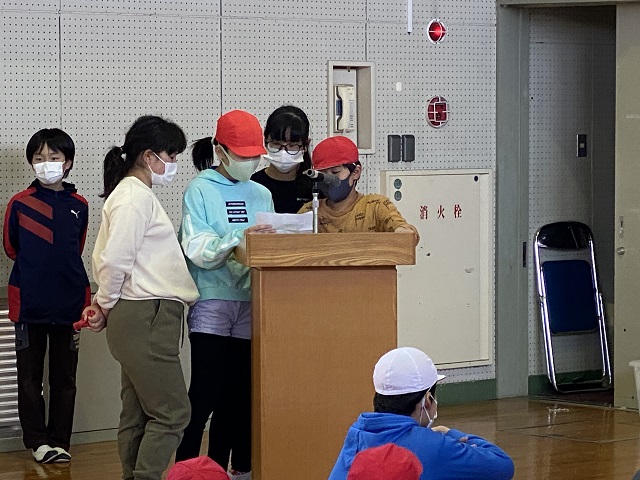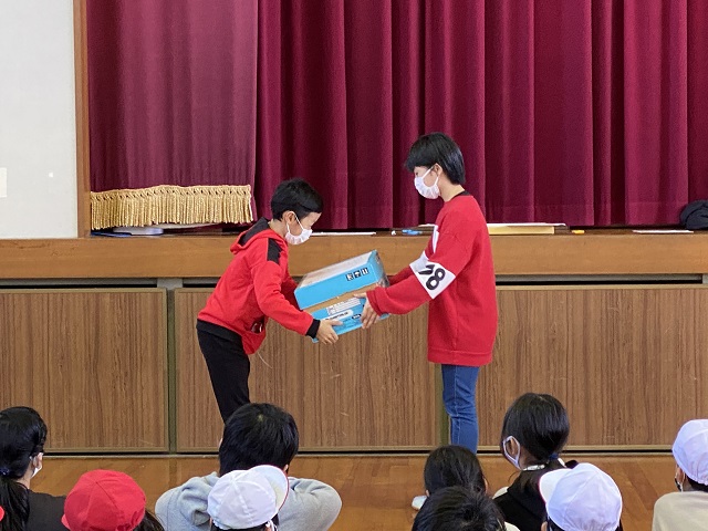 最後に6年生が在校生にお礼の言葉とプレゼント(手作りぞうきん)を渡しました。